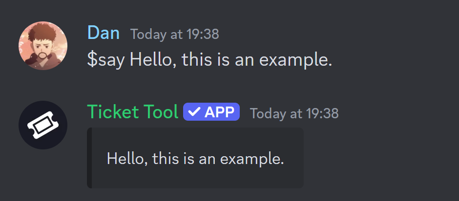 You can use an argument on its own, to create a 'say' type command, in which Ticket Tool reposts everything included after the trigger, or use the argument as a placeholder text in a predefined message to be replaced by whatever you include after the trigger.