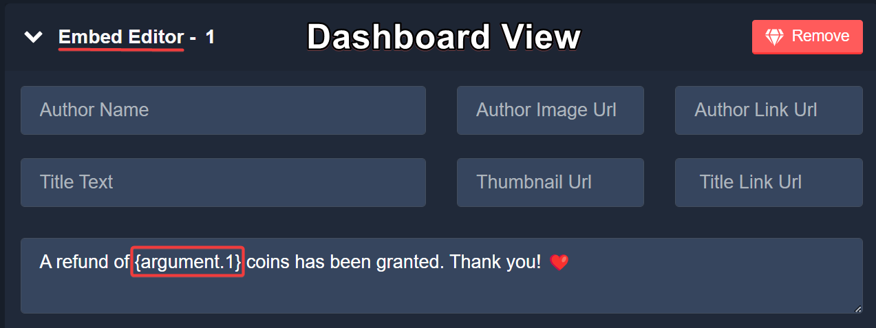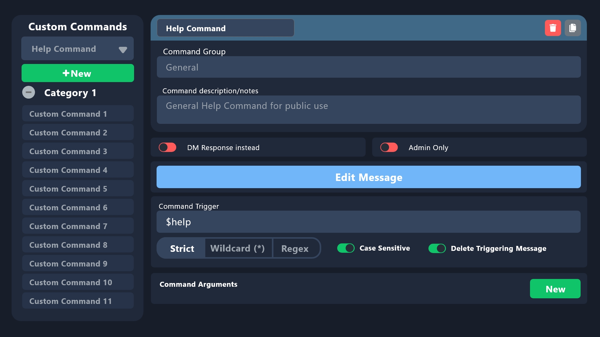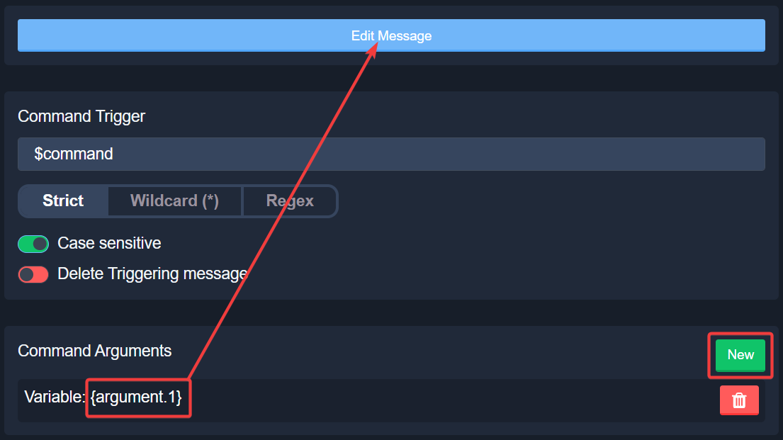 Command Arguments act as variables that allow you to display information included in the command usage onto the custom command response. This feature is particularly useful as it can be used for many different purposes. To add command arguments, you can click on the green New button. You can then include the variable prompted in your custom command message.
