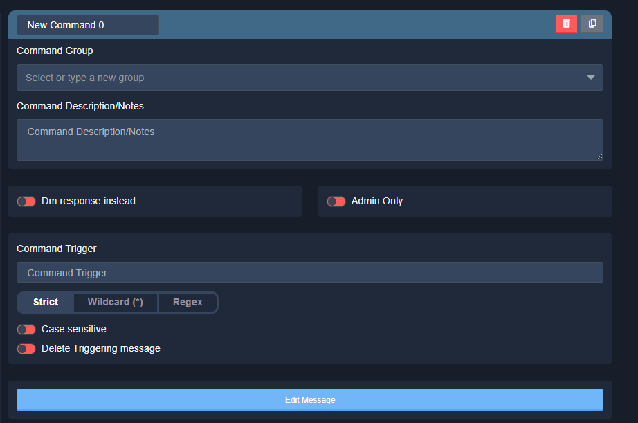 Case sensitivewill make the triggers check for the specific case you stated.When enabled, the user’s message that triggered the custom command will be deleted after the message has been sent.