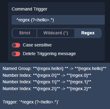 We also support RegEx named groups, which you can access to by using the {regex.NAME} or {regex.INDEX} variables (replacing the name or index but it's value). An small sample of how you can use this feature is shown below: