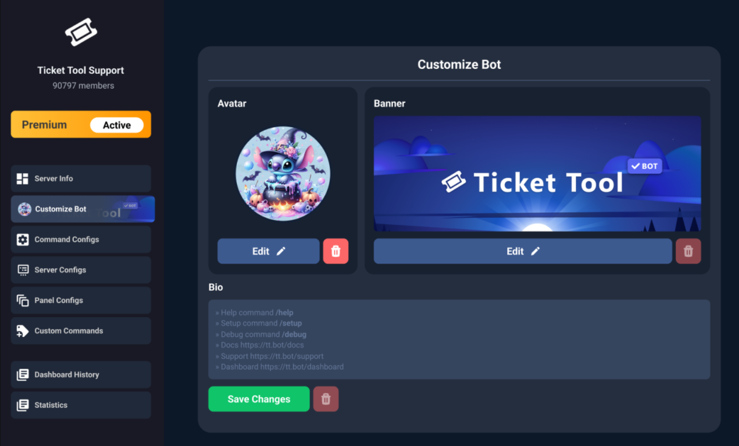 Here you will be able to further customize several aspects of Ticket Tool for your server. Please note this only changes the profile of Ticket Tool within your server only and is not a whitelabeled instance of the bot. It will continue to behave and appear as Ticket Tool in Direct Messages.