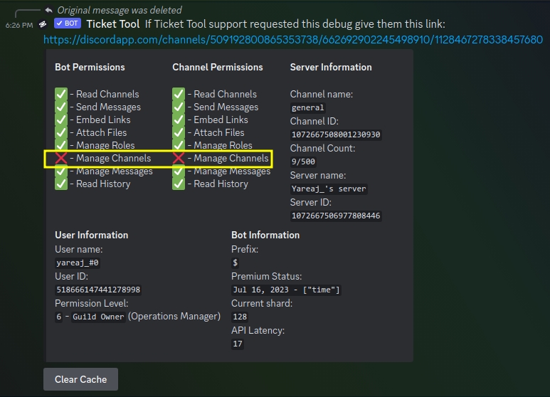 command to diagnose which permissions the bot requires, the permissions marked with❌
