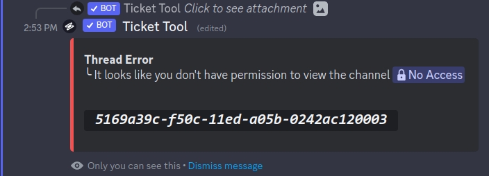 This error takes place when Thread Style tickets are enabled, and the ticket owner has no access to the parent channel for the thread: