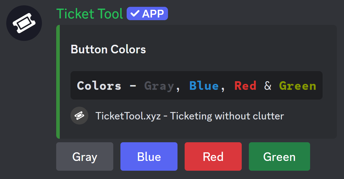 Select one of the four button colors supported by Discord to further customize your buttons! The default color for all buttons is gray.