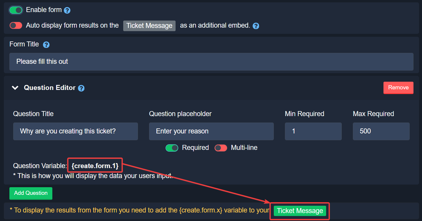 Enable this feature to attach an embed automatically to your Ticket Message which includes the responses summary for this form.