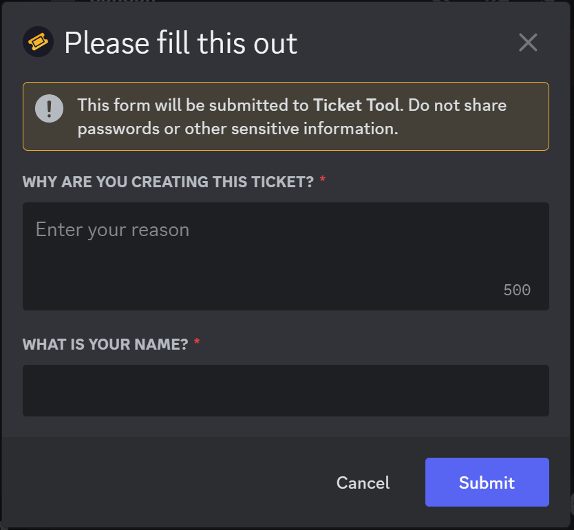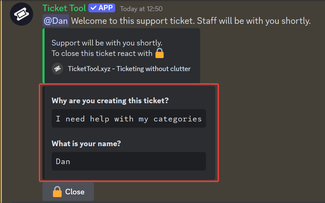 For servers using the free plan, there is a limit of 250 characters for your Ticket Message's embed description. If that's the case, then we would strongly recommend using the Auto Display Results feature to display your form answers ensuring no limit affects the response content.