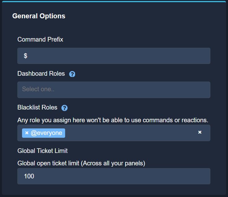 Panel Configs, open theButton Option- Create ticket, and check which roles have been selected asDisabled Roles, a user with one of these roles will not be able to use this feature. If theSupport Team roleoption is enabled then your staff and only your staff will be able to interact with this button, not your server users.