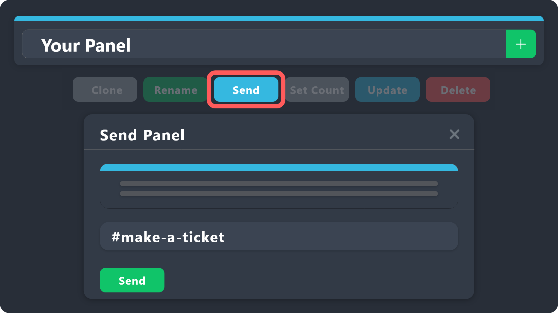 Using the blue Send button, select the channel you want your panel to be sent to and confirm the action by clicking on the green Send button: